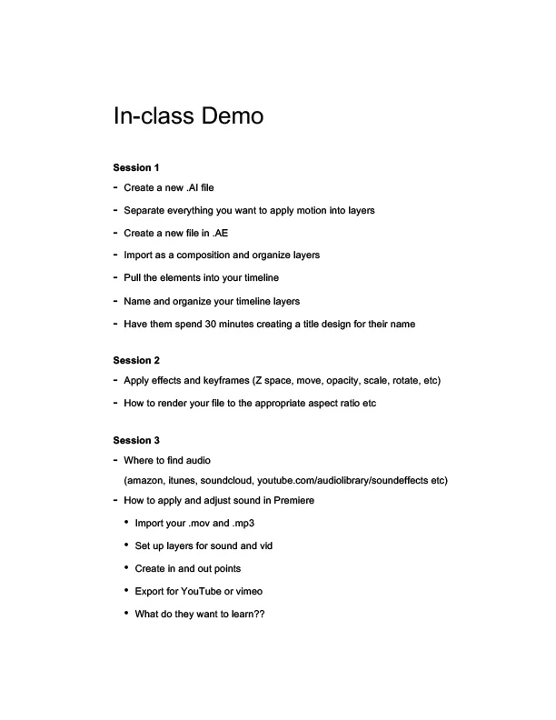 I've created a draft outline of each demo session that I intend to refine and adjust as necessary. My goal is to focus on the importance of cadence/timing, sound design, informational hierarchy, and the necessity of a solidified storyboard. The students must consider every frame, transition point, and fully commit to creating their stills in Adobe Illustrator so that their vision can be imported easily into After Effects.